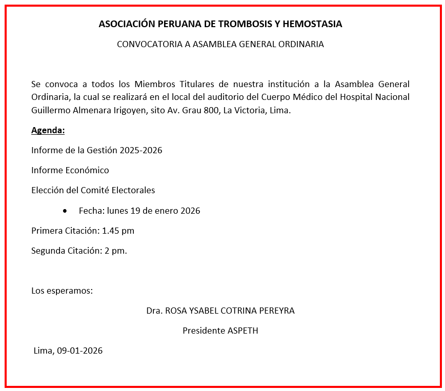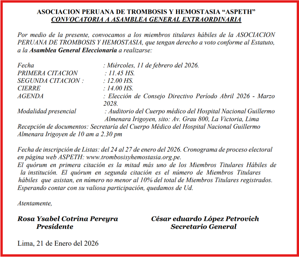 Por medio de la presente, convocamos a los miembros titulares hábiles de la ASOCIACION PERUANA DE TROMBOSIS Y HEMOSTASIA, que tengan derecho a voto conforme al Estatuto, a la Asamblea General Eleccionaria a realizarse: