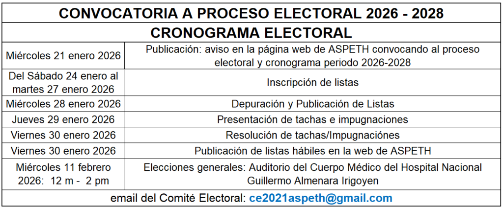 Fecha de inscripción de Listas: del 11 al 14 de enero del 2025. Cronograma de proceso electoral en página web ASPETH: www.trombosisyhemostasia.org.pe.